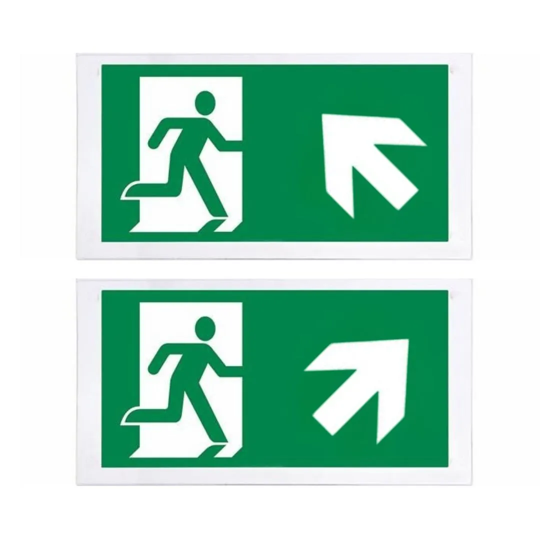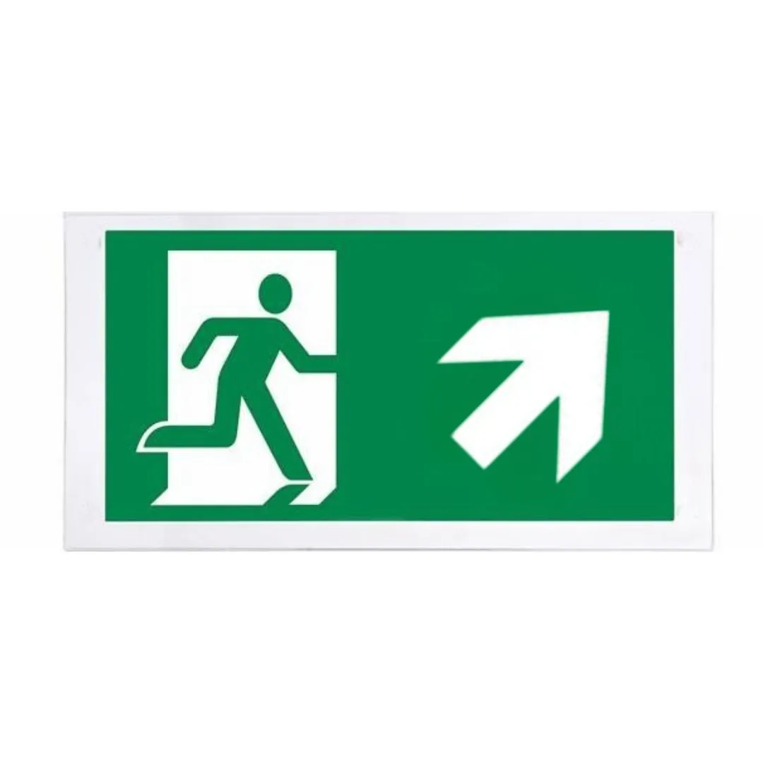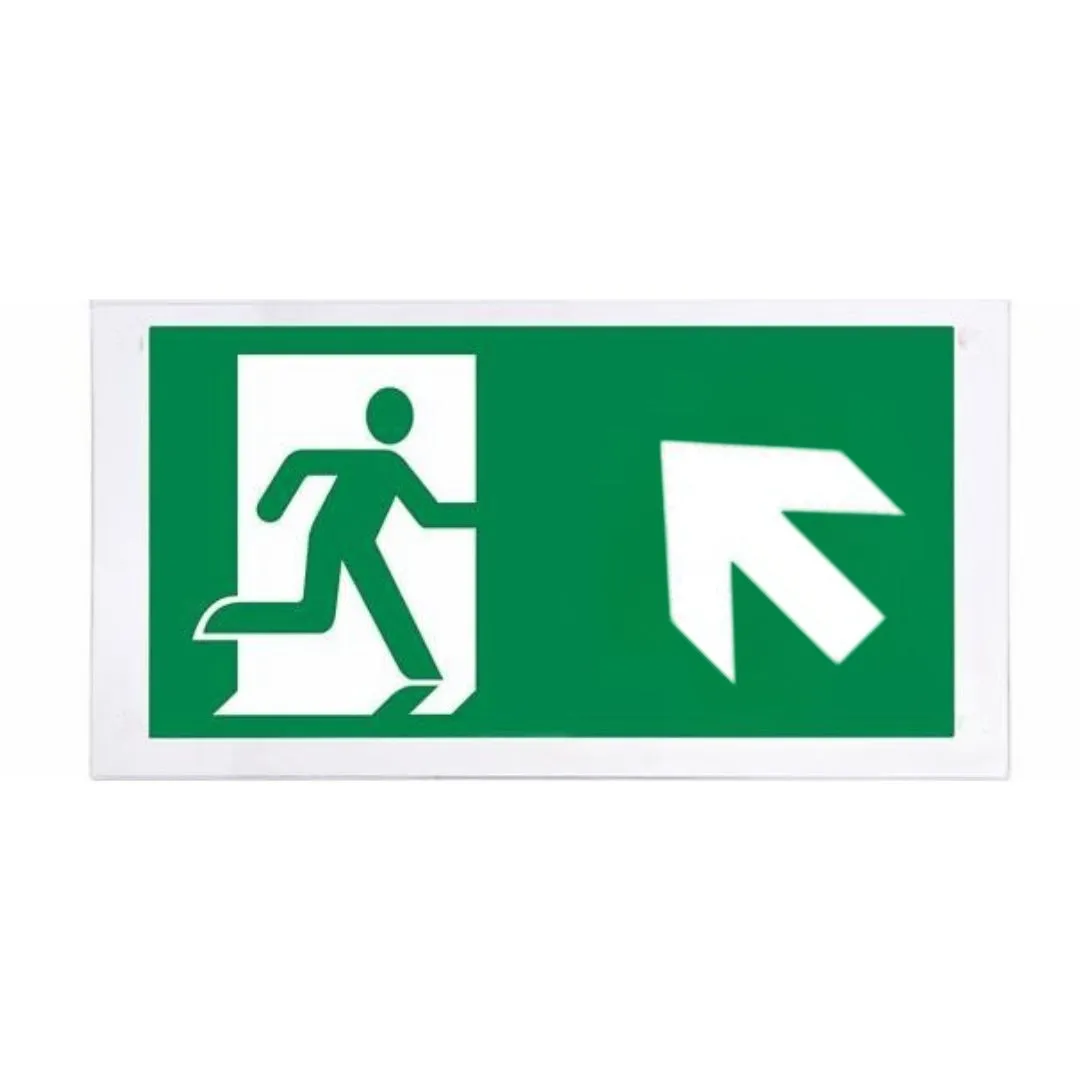 De losse plexiplaat met vluchtweg pictogram links – rechts omhoog is geschikt voor de kantel noodverlichting armaturen en heeft een zichtbereik van 27 meter. De plexiplaat is makkelijk om te wisselen in het kantel armatuur.