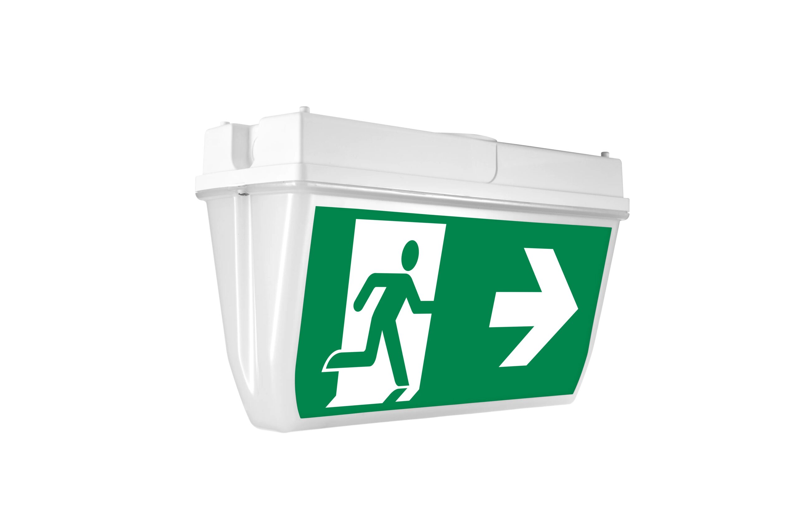 De A805 noodverlichting is een robuust opbouwarmatuur voor plafondmontage, ontworpen voor duidelijke vluchtwegindicatie in uiteenlopende omgevingen. Dankzij de IP65-beschermingsgraad en slagvastheid IK08 is het armatuur geschikt voor zowel binnen- als buitengebruik, ook in vochtige of stoffige ruimtes. De behuizing en afdekking zijn vervaardigd uit wit kunststof met een opaal diffuserpaneel dat zorgt voor een gelijkmatige lichtverdeling.