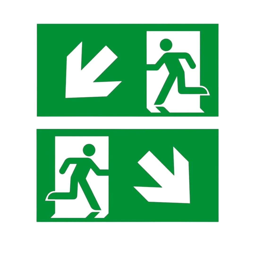 De betekenis van een pijl die schuin omlaag gaat is dat de vluchtroute naar beneden via een trap gaat en daarbij naar links of rechts afhankelijk van de richting van de pijl.